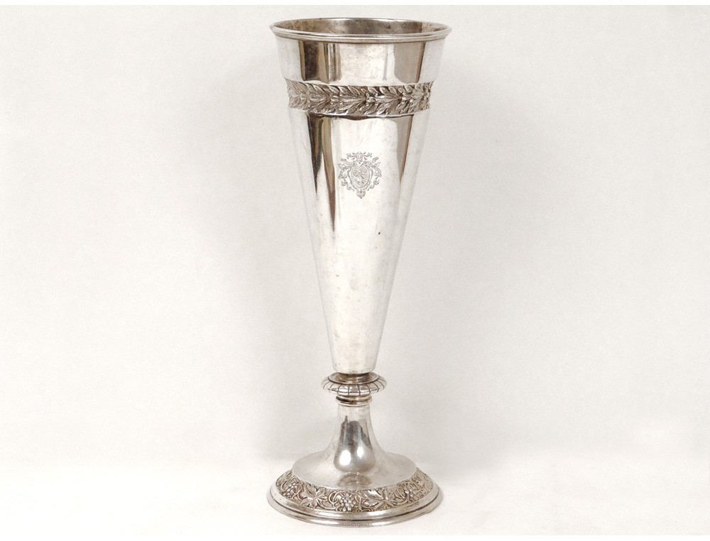 Beautiful vase or cup finely crafted sterling silver, decorated with a coat of arms consists of a dove, three stars and a marked Teneo Pacem banner, decorated with a plant frieze at the top, chopped up leaves vine and grapes, Austrian and French punch to punch Weevil (imported goods) of XIXth century.